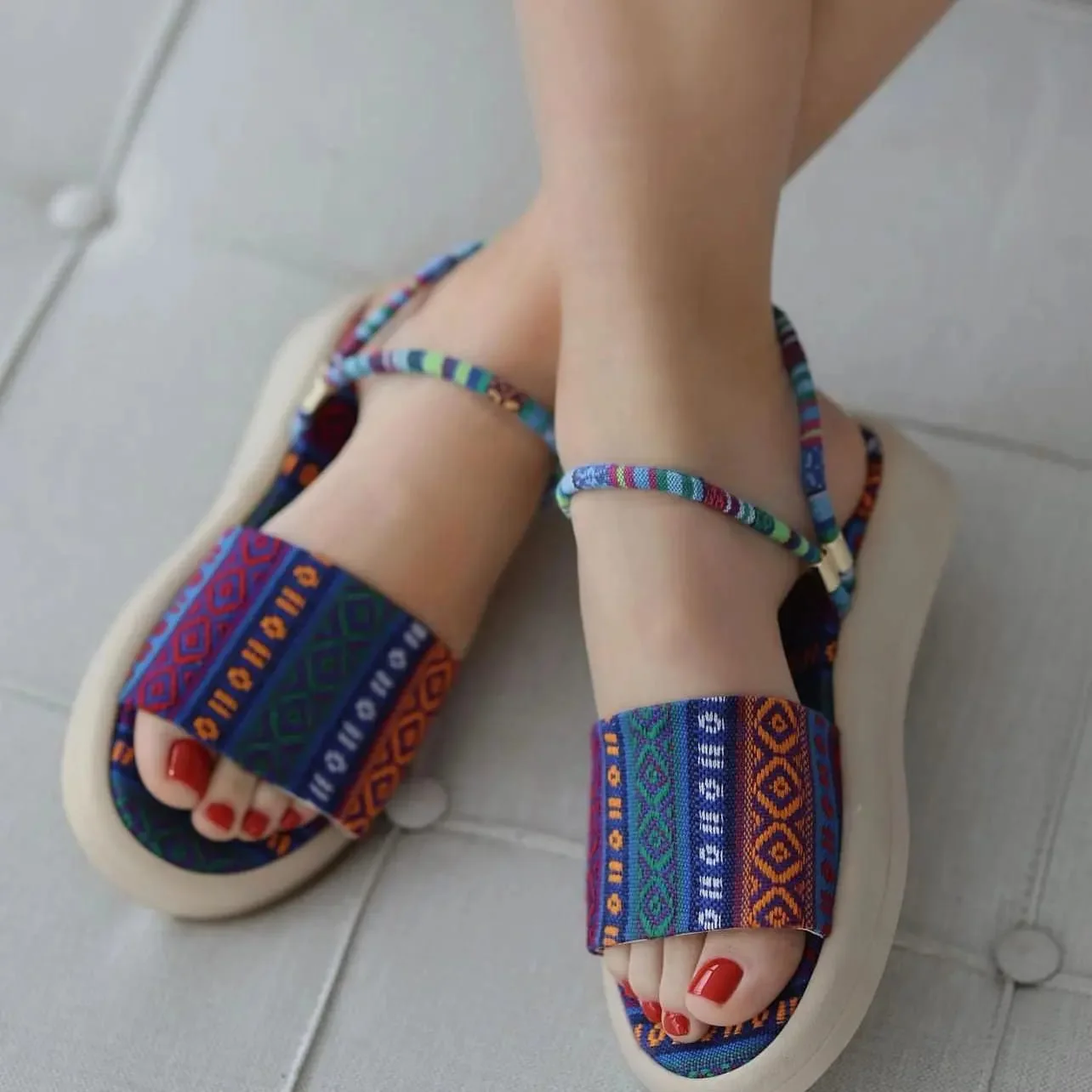 أبرزي أنوثتك هذا الصيف مع صندلنا البوهيمي الفريد، بتصميم مستوحى من روح الحرية والألوان المبهجة.